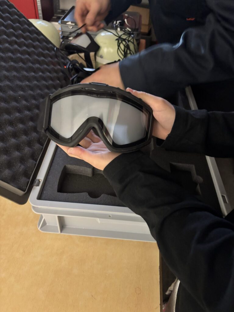 Eine weitere Übung stellte die Schüler:innen vor eine besondere Herausforderung: Mit einer sogenannten „Nebelbrille“, die eine starke Sichtbehinderung simuliert, mussten sie eine 80 Kilogramm schwere Übungspuppe finden und retten.