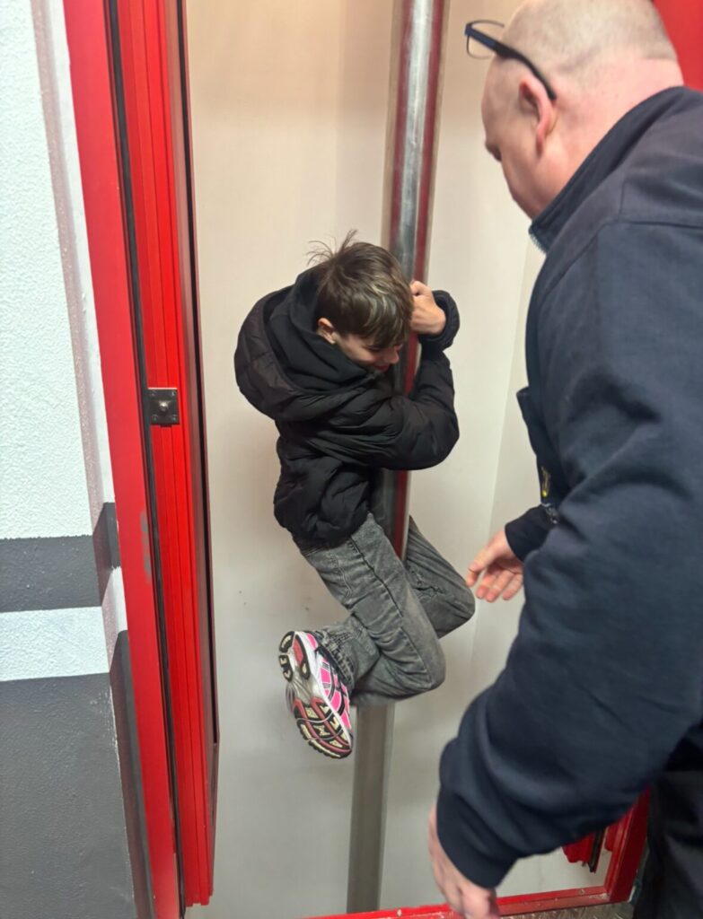 Während ihres Aufenthalts lernten die Schüler:innen zunächst die Räumlichkeiten der Feuerwehr kennen – inklusive einer Fahrt an der berühmten Feuerwehrstange. Zudem konnten sie einen Parcours absolvieren, den auch die Feuerwehrmitarbeiter:innen einmal jährlich bewältigen müssen.