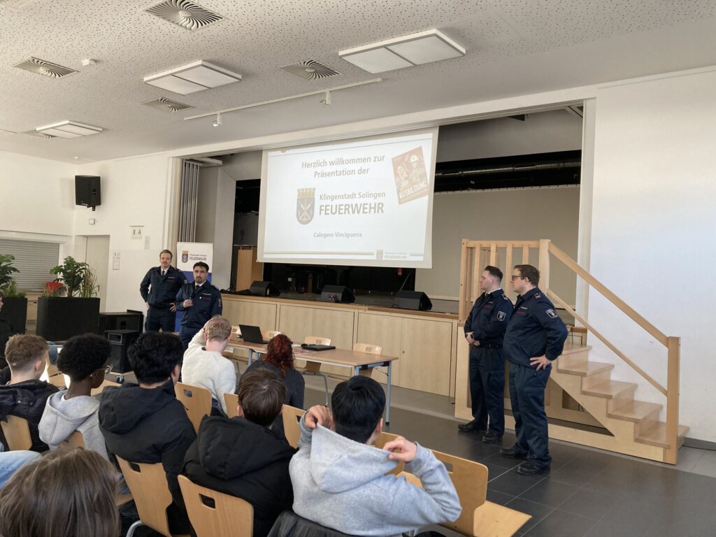 Vertreter der Solinger Feuerwehr stellten die unterschiedlichen Einstiegsmöglichkeiten in die Berufsfeuerwehr vor und erläuterten den typischen Arbeitsalltag. Dabei ging es sowohl um die beruflichen Anforderungen als auch um die vielfältigen Aufgabenbereiche innerhalb des Feuerwehrdienstes.