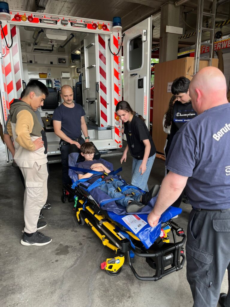 Ein besonderes Highlight war die Erkundung eines echten Rettungswagens. Die Schüler:innen durften nicht nur einen Blick ins Innere werfen, sondern auch einige der Funktionen selbst ausprobieren – eine Erfahrung, die sicher noch lange in Erinnerung bleiben wird.