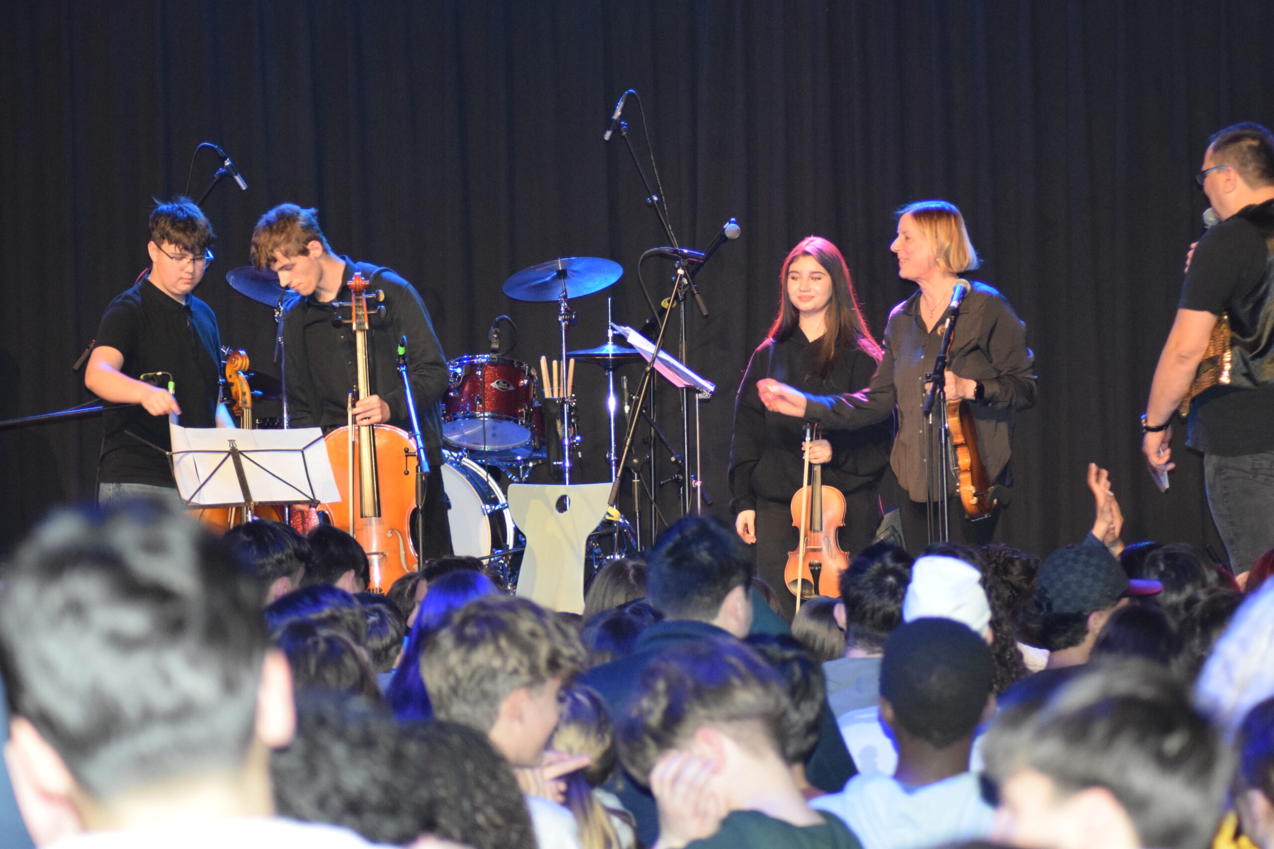 Im Anschluss begeisterte das Streicher-Ensemble gemeinsam mit Frau Sherif. Die beteiligten Schüler:innen haben im Drehtürmodell an unserer Schule begonnen, ihre Instrumente zu erlernen, und überzeugen seit Jahren mit ihren musikalischen Fortschritten und Auftritten.