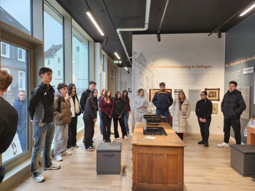 Die Klasse 10d besuchte das Max-Leven-Zentrum in der Solinger Innenstadt. Die Bildungs- und Gedenkstätte befindet sich am ehemaligen Wohn-, Arbeits- und Todesort des Kulturkritikers Max Leven, der 1938 in der Pogromnacht ermordet wurde. Die Schüler:innen zeigten sich besonders beeindruckt von der interaktiven und multimedialen Auseinandersetzung mit der Geschichte des Ortes.